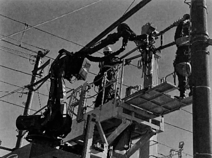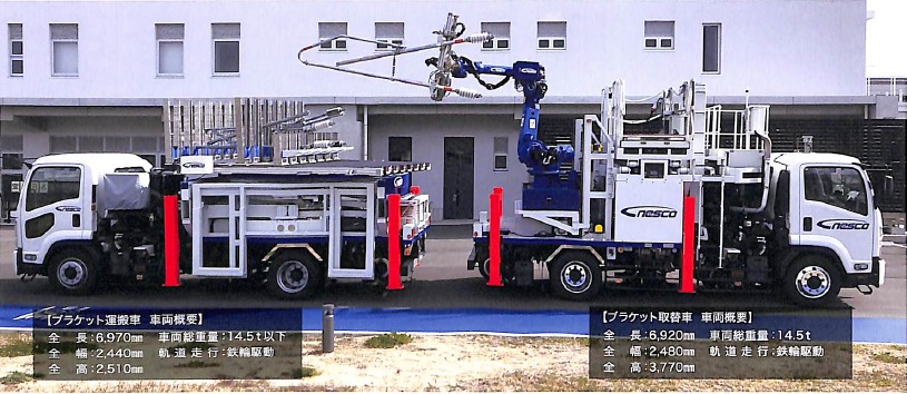 上記写真の様にブラケット取替車と運搬車が対になって運用され、載線し現場まで走行した後、運搬車の荷台に積まれたブラケットを取替車のロボットアームで掴み、架線柱まで移動させる作業を自動化している。