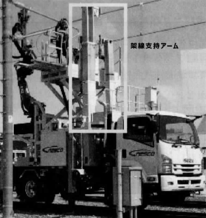 架線柱に取付されている架線を支持する部分はブラケットと呼称され、軌陸高所作業車を用いて交換される。
