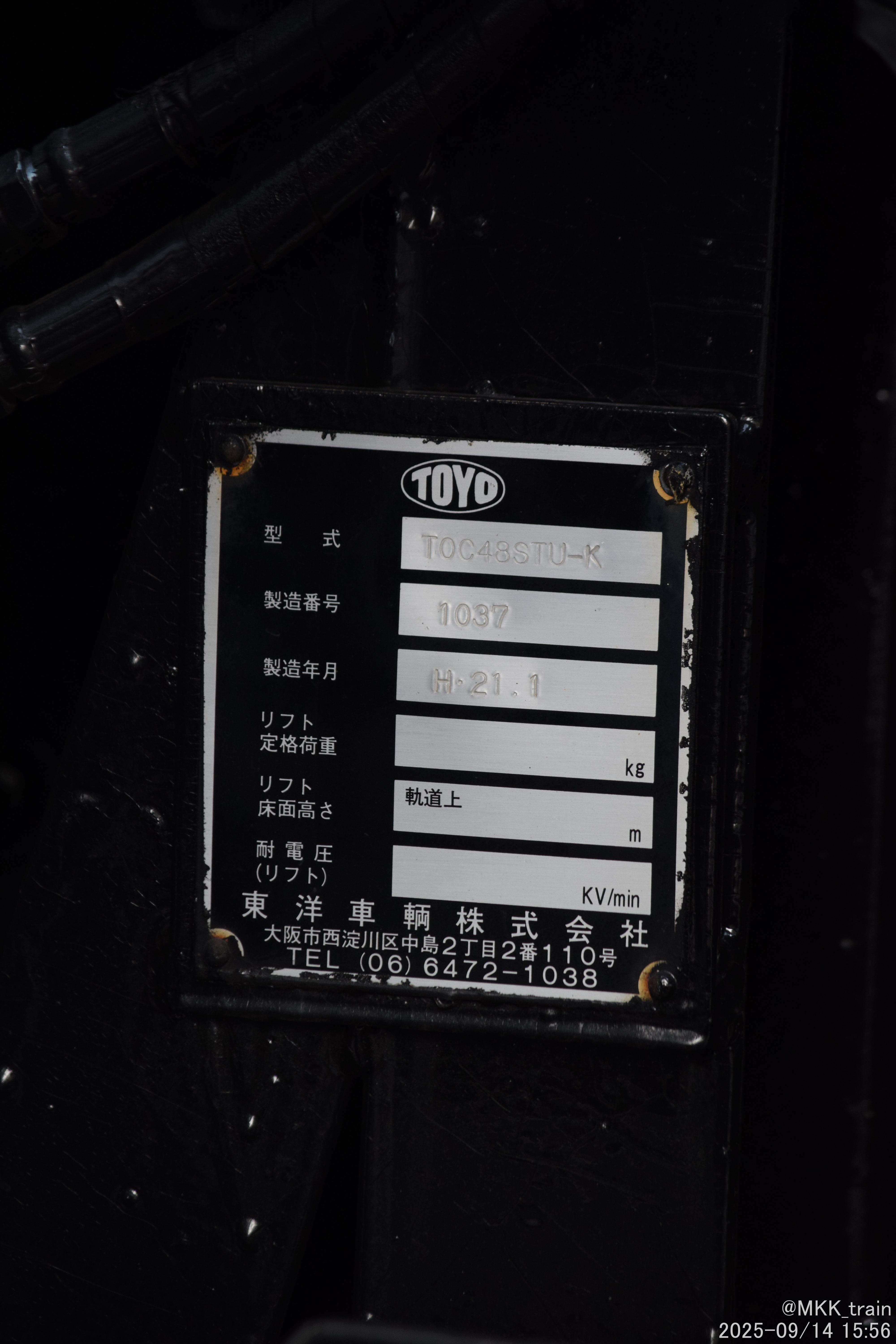 ISUZU_FORWARD_NESCO_null_1143 Home › フォーラム › 71_軌陸トラック › ISUZU_FORWARD_NESCO_null_1143 タグ: 広島市東部地区連続立体交差事業 このトピックには1件の返信、1人の参加者があり、最後に梶渡広人により5ヶ月、 3週前に更新されました。 2件の投稿を表示中 - 1 - 2件目 (全2件中) 投稿者 投稿 2024年6月7日 10:02 AM #36746 梶渡広人モデレーター 岡山800 は 11‐43 東洋車輌 TOC48STU-K (推定) 2024-06/02 広島市東部地区連続立体交差事業 作業ヤード 2024-07/06㋵ 山陽本線 海田市ー向洋間 広島市東部地区連続立体交差事業 仮下り貨物線用トラス設置作業 2025年9月14日 10:25 PM #44261 梶渡広人モデレーター 2025-09/14 広島市 <銘板> 型式 TOC48STU-K 製造番号 1037 製造年月 H21-1 東洋車輌株式会社 投稿者 投稿 2件の投稿を表示中 - 1 - 2件目 (全2件中) このトピックに返信するにはログインが必要です。 ログイン ユーザー名: パスワード: ログイン状態を保持 Xでログイン ログイン